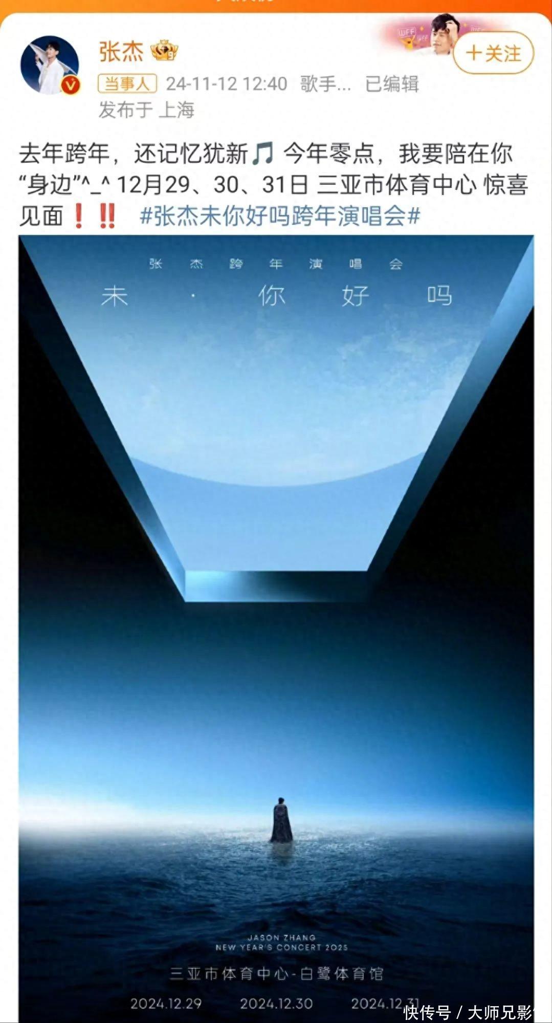 江南君获悉皇冠abcd盘,11月12日下昼,张杰在酬酢媒体平台上安逸官宣2025跨年演唱会将在2024年12月29日、30日、31日在三亚市体育中心-白鹭体育馆劝诱举办三场。